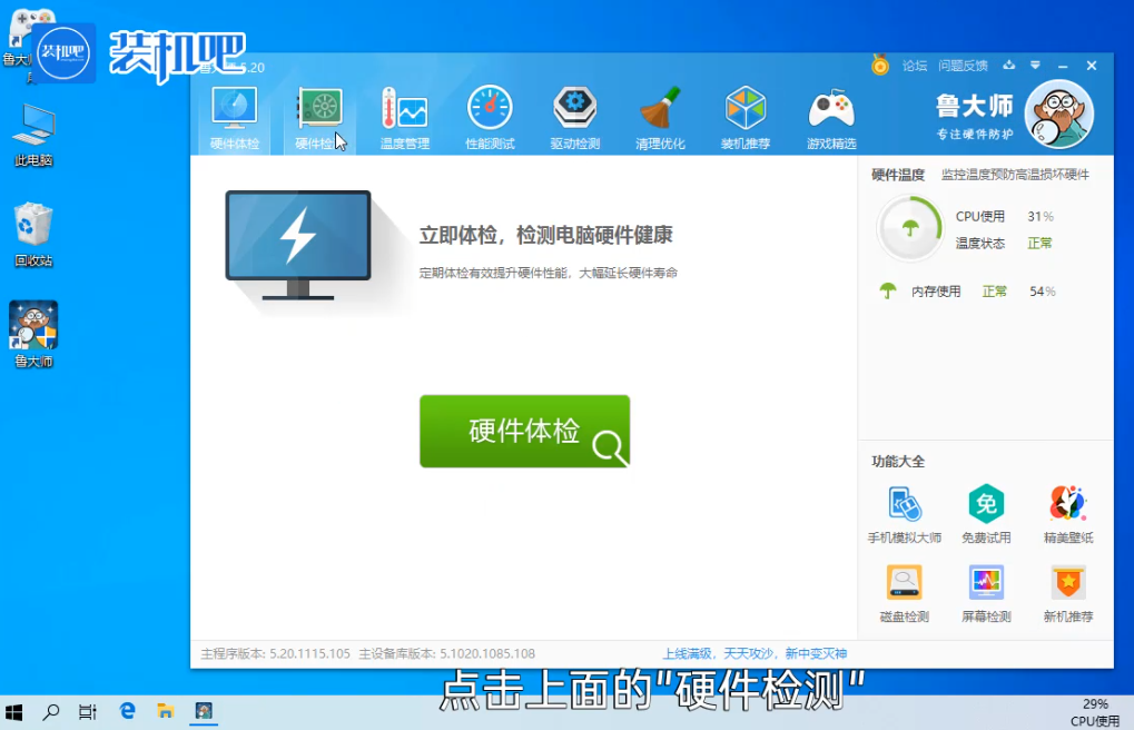 1、下载打开鲁大师,点击上面的“硬件检测”。