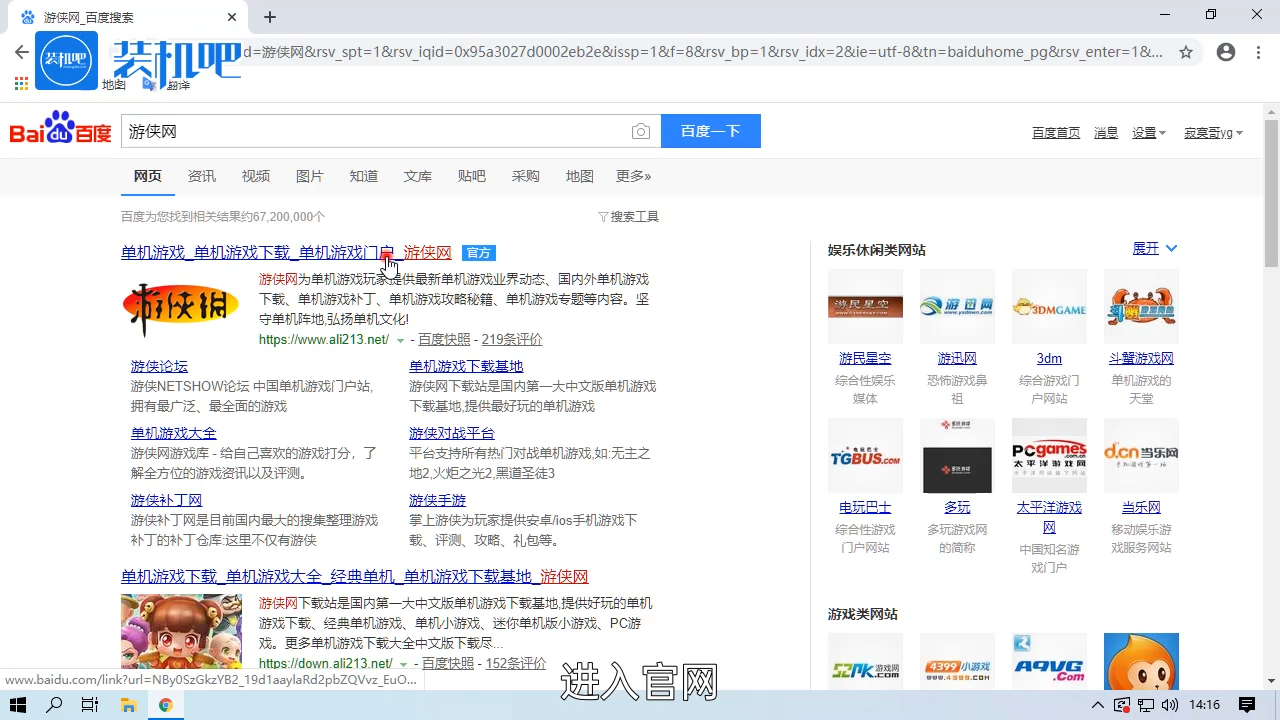1、百度搜索“游侠网”,点击进入游侠网官网。