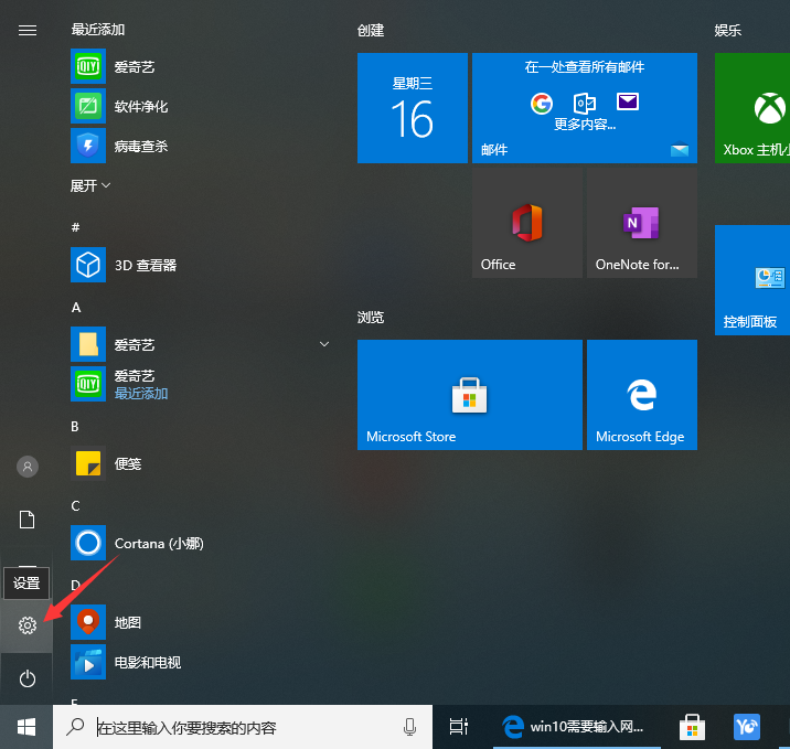 1、首先点击开始菜单选择设置图标进入即可。