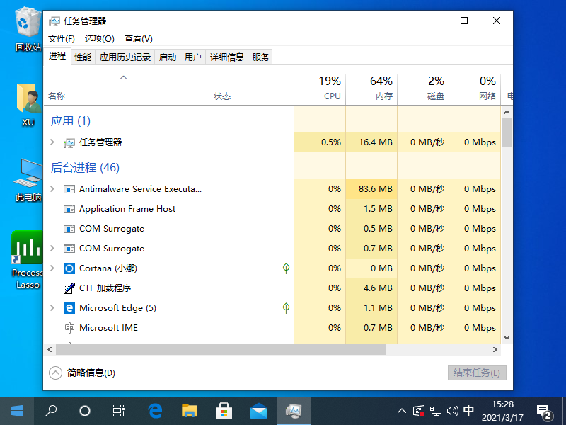 1、面对 Windows 10 系统内存占用突然变高的问题我们可以通过打开 Windows 任务管理器,在任务管理器中可以实时查看当前运行的什么进程占用的资源比较高,如果有异常的程序可以尝试强制结束掉。