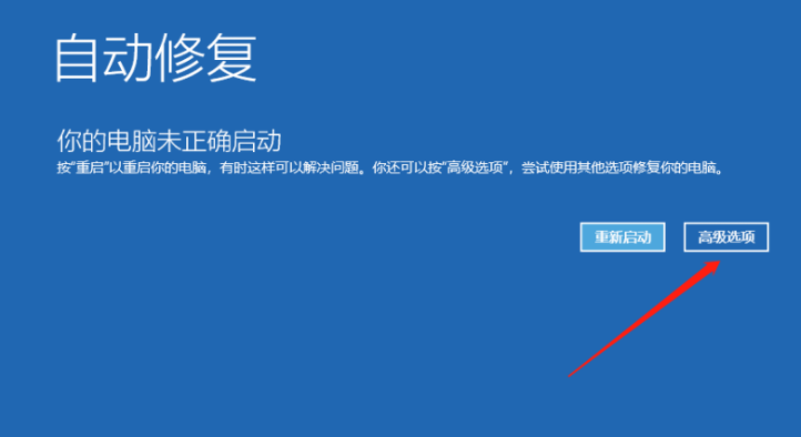 1、首先长按开机键,重复三次左右,之后开机则会进入到自动修复界面,然后选择高级选项。
