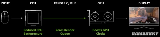NVIDIA Reflex主要就是优化了CPU到GPU之间的工作流程,它允许CPU可以将运算好的资料提前丢给显卡做渲染。省去了用户操作鼠标后给CPU,然后CPU走排队流程,等待整个处理序列完事后一起丢给显卡的时间,(相当于是走了一个插队流程)。