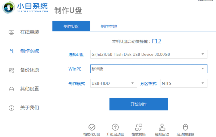 1、将一个8g以上的空U盘插入电脑,打开小白一键重装系统软件,使用前关闭杀毒工具,等待小白检测环境完成后,点击制作系统,【开始制作】。