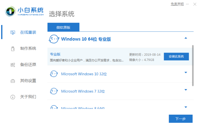 1、下载并打开小白一键重装系统软件,选择需要安装的win10系统。(4g以上内存选择64位系统)