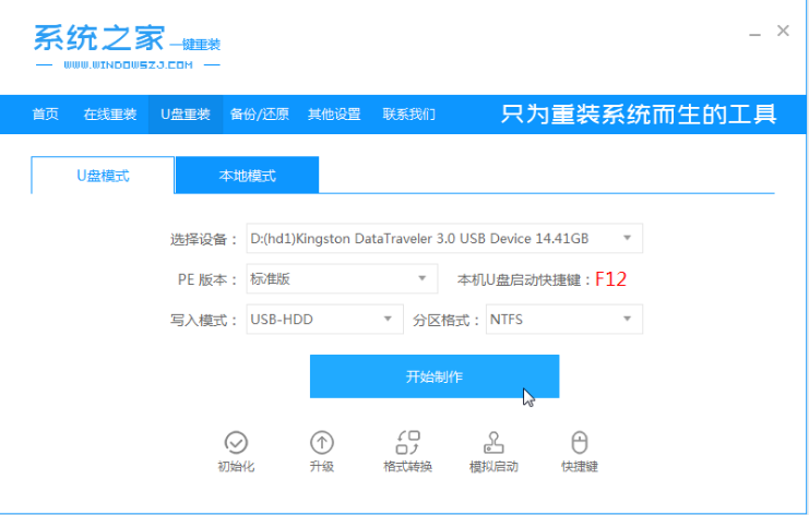 1、在电脑上下载安装系统之家一键重装系统工具,关闭电脑的杀毒软件,插入一个8g以上的空白u盘,选择u盘模式开始制作。