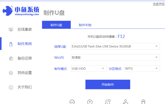 1、把u盘插到电脑当中,打开工具,选中制作系统,点击开始制作。