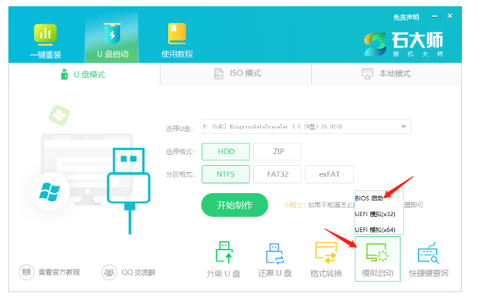 4、制作成功后,还需要点击软件右下角的模拟启动,用以测试U盘启动盘是否制作成功。