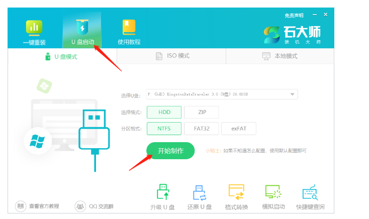 1、进入页面后,选择U盘启动,无需更改默认格式,直接点击开始制作即可。