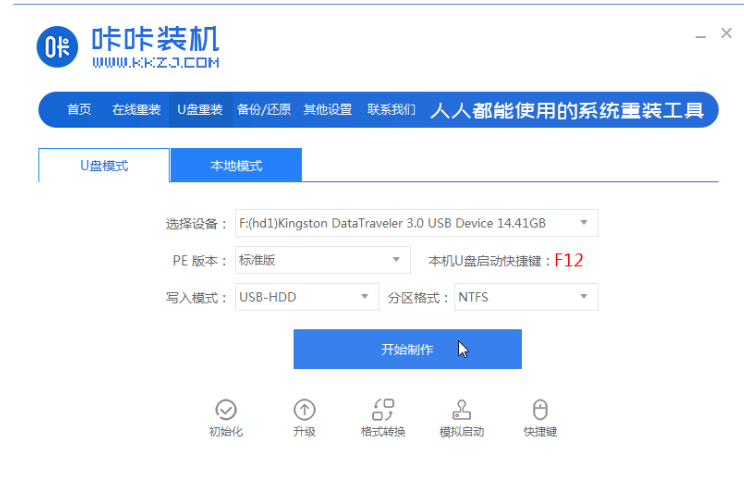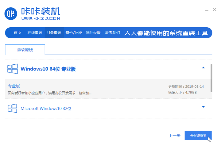 2.打开主页后,选择u盘重装系统模式,点击开始制作按钮,选择需要安装的win10系统。