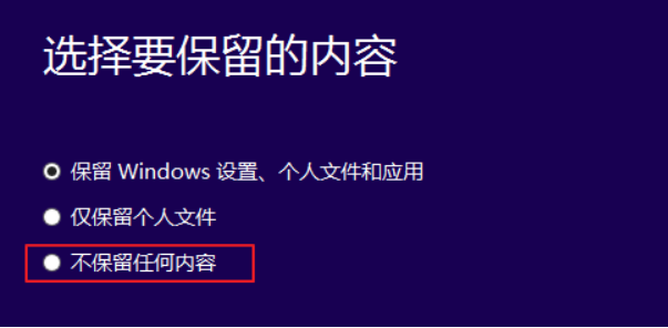 7、将“保留windows设置,个人文件和应用”改成“不保留任何内容”,即将C盘全部重置。