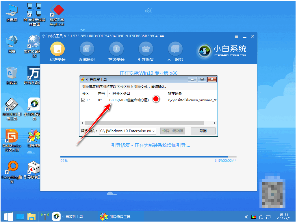 4、弹出引导修复工具页面,在分区C盘前打勾,等待系统自动安装完成后,手动拔掉U盘,点击立即重启。