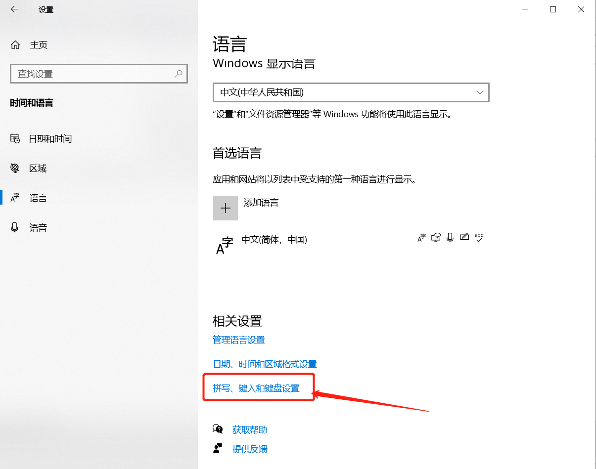 3、在语言中找到”拼写、键入和键盘设置“的选项,并打开。