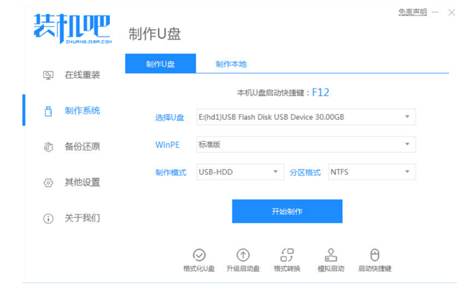 1、下载安装装机吧工具软件,插入U盘,选择制作系统,点击开始制作。