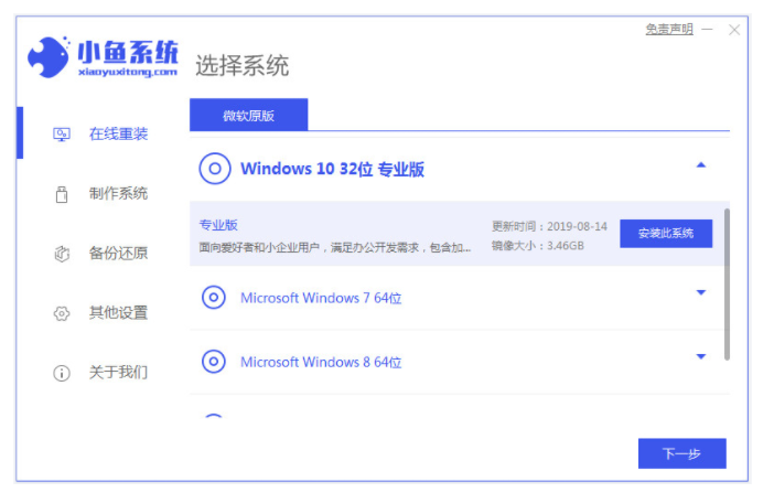 1、下载安装好小鱼一键重装系统工具打开,选择win10系统点击安装此系统。