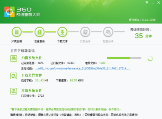 6、开始准备重装前的文件扫描,接下来根据 360重装系统大师的安装向导安装完成即可。