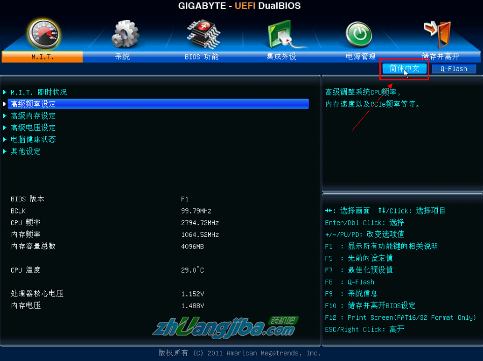 如下图,技嘉主板中英文切换只需要点击右上角的”简体中文”切换按钮即可。