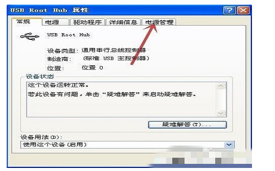 6.在弹出是“USB Root Hub属性”对话框中点击“电源管理;”