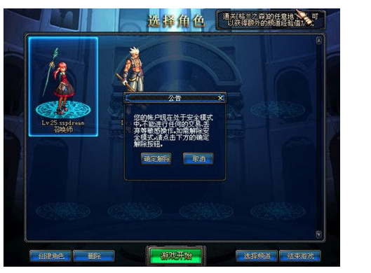 1、进入游戏界面后,如果看见以下提示则表示账号进入了安全模式,需要您验证密保进行解除。