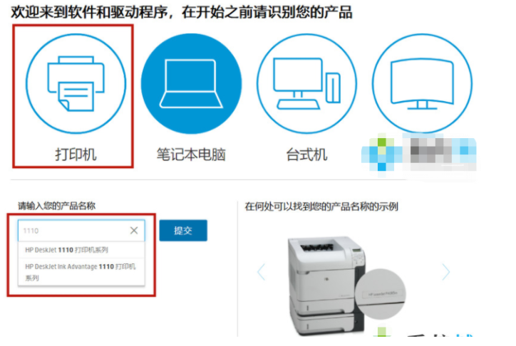 2.之后选择“打印机”,跳转进入新的页面。然后查看自己的打印机型号,一般打印机上面有显示。请输入你自己的打印机编号,如1110,在“产品名”中输入你自己的打印机。之后根据下拉选择具体的型号,点击“提交”;