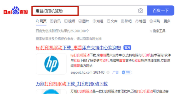 1.直接在百度中搜索“惠普打印机驱动”,点击后面有“官方”标识的网站就可以惠普驱动的更新网站。