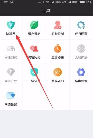 1.注意是否有人在蹭网:如果有人在使用我们的网络下载大文件,或是看视频的话,网络就会有明显的卡顿。点击路由器设置的“防蹭网”图标。