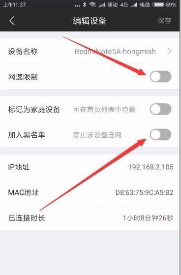 3.打开设备的详细页面,可以为其设置限速,或是直接把其加入到黑名单中,不让其连接我们的路由器。