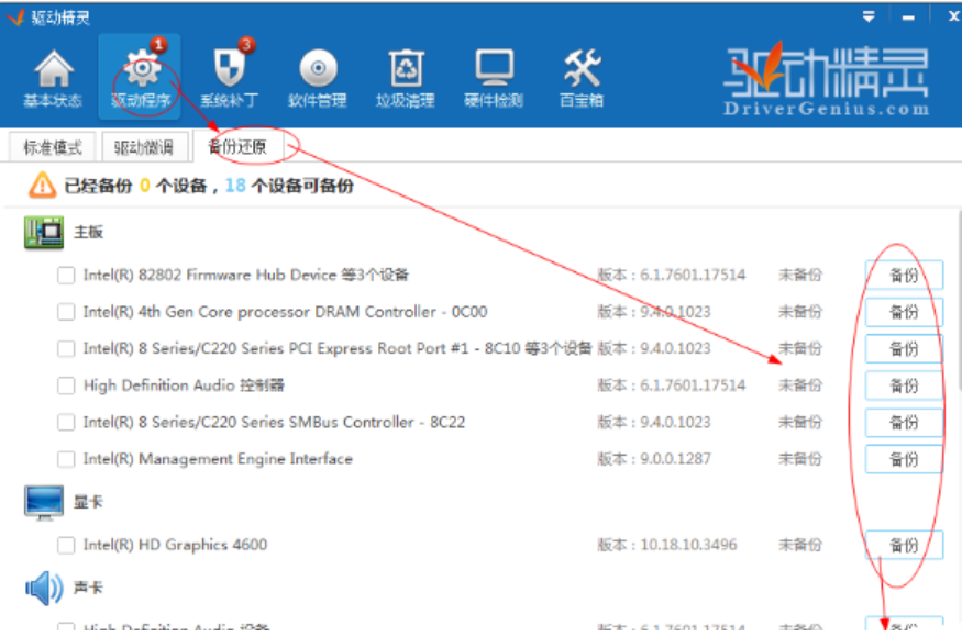 3.在【驱动程序】下的有个【备份还原】的功能,如果电脑还原了,里面的驱动也是可以直接还原的。