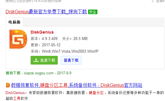 1.首先,在搜狗上输入“分区工具diskgenius”字样,然后点击下载