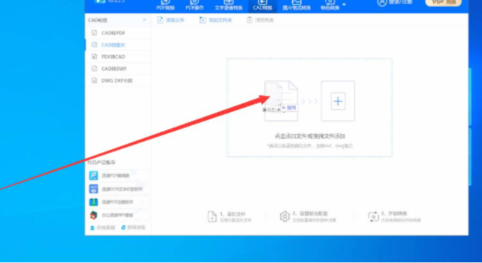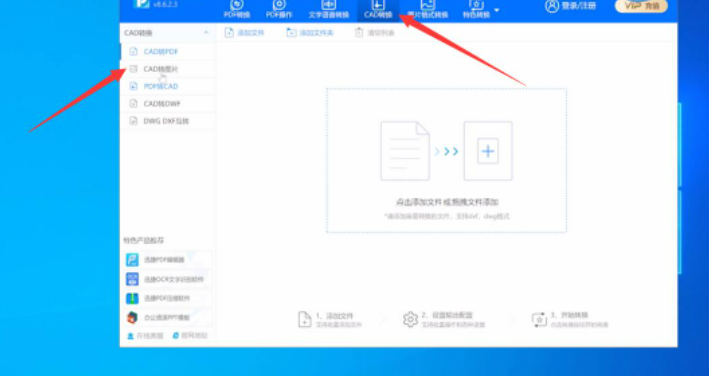 1、打开迅捷PDF转换器,点击CAD转换,选择CAD转图片,把文件拖拽到软件中间虚线框内
