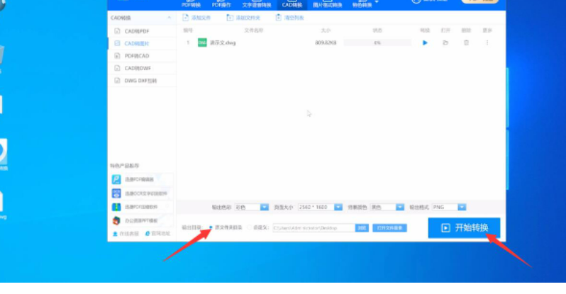 2、把输出格式设置为PNG,勾选原文件夹目录,点击开始转换,等待转换完成,打开转换后的PNG文件即可