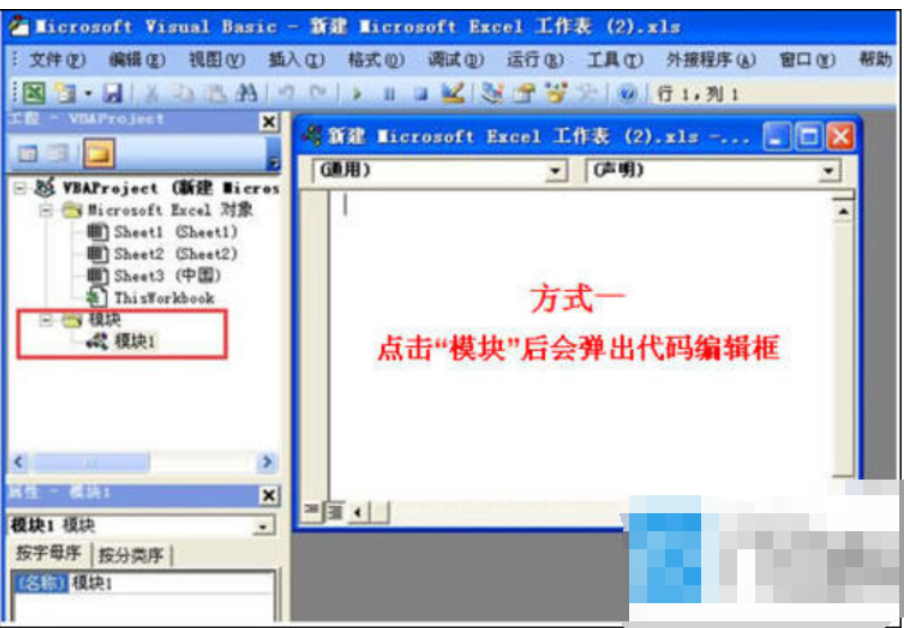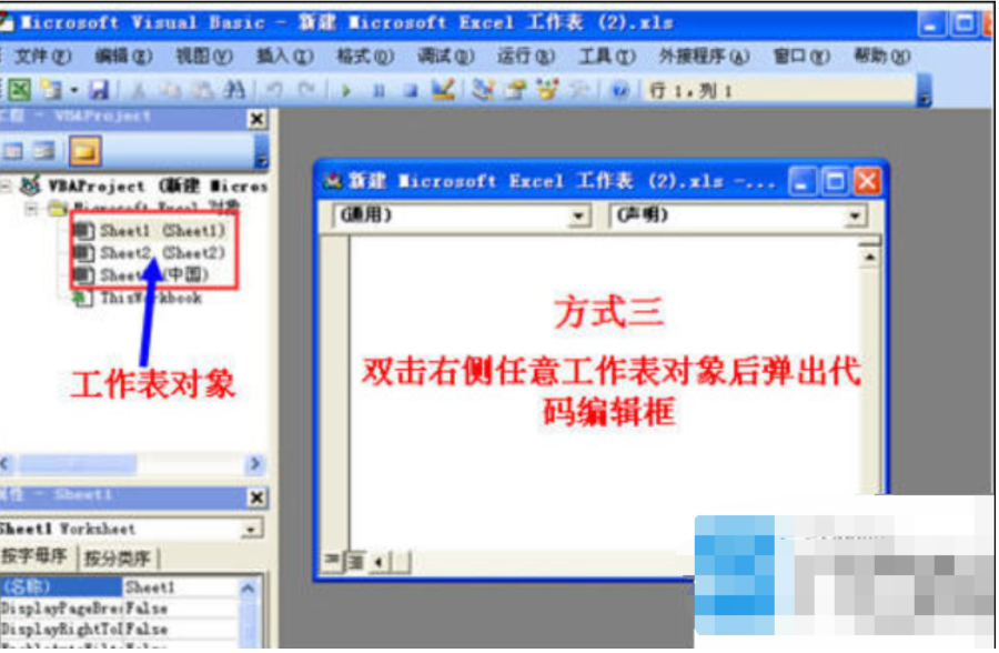 (说明一下:方式一打开的窗体没有默认对象,程序编写时如果要处理工作表或工作簿的数据,必须指明对象,如:对sheet2工作表的单元格进行处理,那么这样写sheet2.cells或sheets(2).cells;方式二和方式一打开的一样,需要指明程序处理的对象;方式三打开的代码框是默认的,也可以重新指定对象,如:双击sheet1工作表,那么在对应的代码框中如果不指定对象,默认对应的是sheet1工作表。)