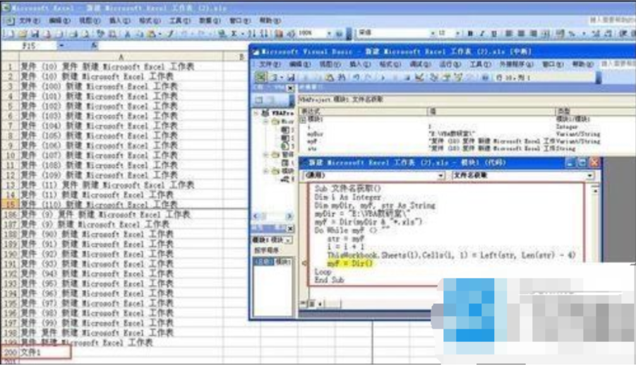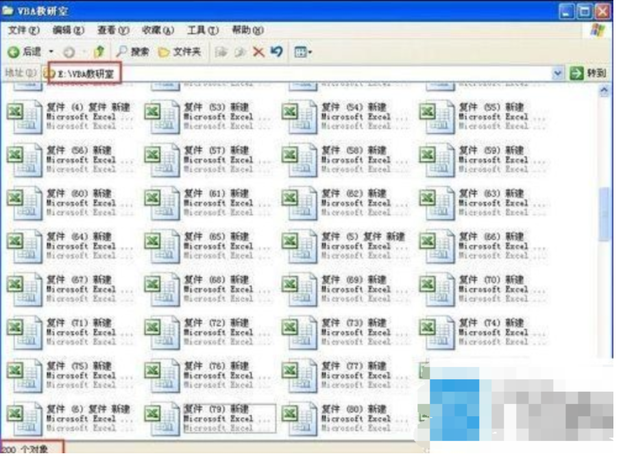 实例:E盘有一个名为VBA教研室的文件夹,文件夹内有200个xls文件,现在我需要获取这200个文件的文件名。