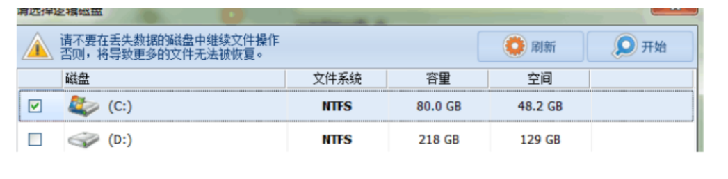 4.勾选所要恢复文件所在的盘符,点击开始