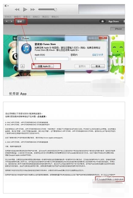 1、打开iTunes工具,打开iTunes store,再点击登录按钮,在弹出的对话框中,点击下面的“创建 Apple ID”按钮。勾上同意条款内容,点击“同意”按钮,进行下一步。