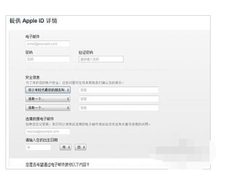 2、填写好电子邮件地址、密码、安全信息、您的出生日期等等一系列的信息,点击下面的继续按钮。流程跟上面用Apple ID官网申请是一致的,跟着系统提示走,走完流程您的Apple ID就已经创建好了。