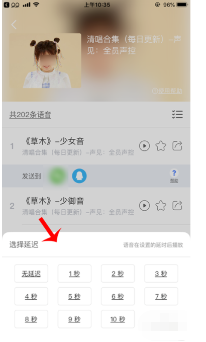 5、选择延迟发送秒数,再点击左下角麦克风图标。