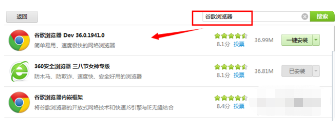 2、其次,我们使用安全软件管家,进行搜索下载安装,这样更加的方便,同时可以去除一些不必要的捆绑的软件哦。搜索谷歌浏览器,然后点击下载安装。