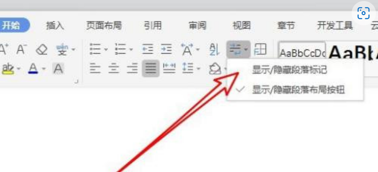 3、选择显示/隐藏段落标记的菜单项。