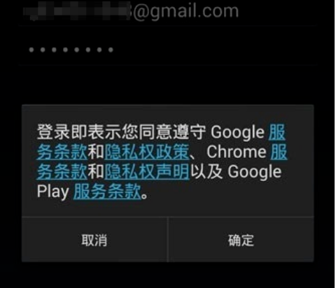 7、输入Google帐户名和密码后,登录时会弹出“服务条款”,点击“确定”。