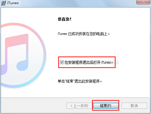 4、完成安装后,我们可以取消默认勾选“在安装程序退出后打开iTunes”,然后点击【结束】完成安装。