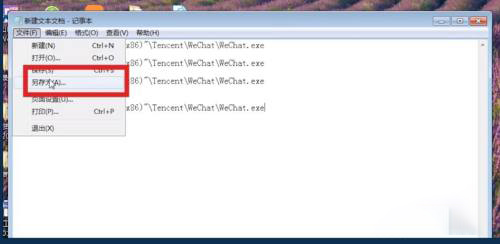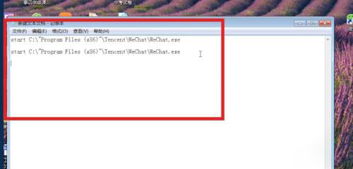 4、在新建文本文档窗口中粘贴刚才复制的目标文件内容,注意编辑修改的英文状态的双引号,同时想要同时打开几个微信,就复制几行。
