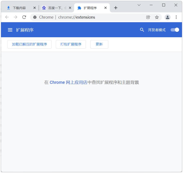 3、打开谷歌浏览器,打开扩展程序-打开开发者模式-点击 加载已解压的扩展程序。