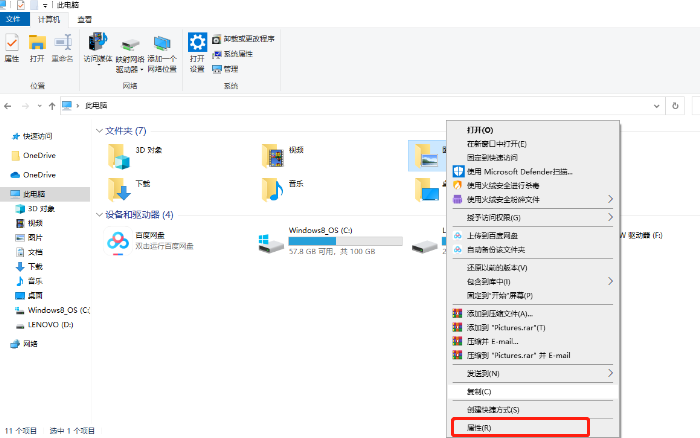 1、按下键盘的【Win+E】键打开资源管理器,鼠标右键点击【图片】,然后选择【属性】;