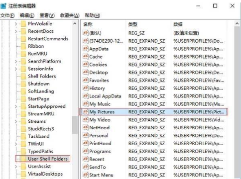 打开注册表找到并修改“My Pictures”的数值数据。