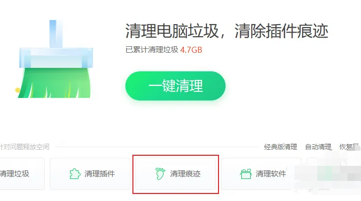 2、可以看到电脑页面下方有一个“清理痕迹”,我们点进去。