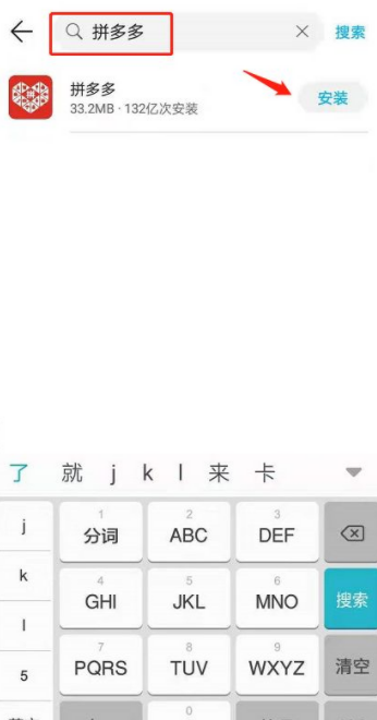 2、点击进入应用市场后点击上方搜索栏搜索“拼多多”。