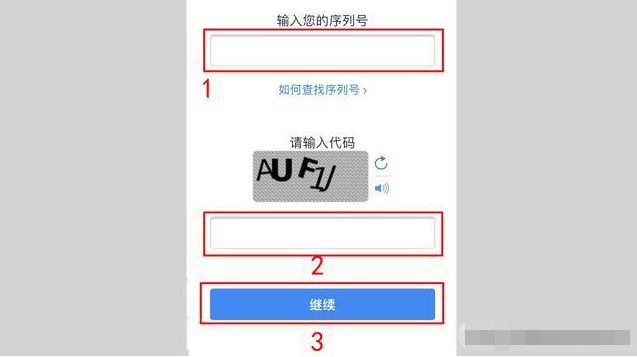 3、接着输入手机序列号及验证码,点击继续。
