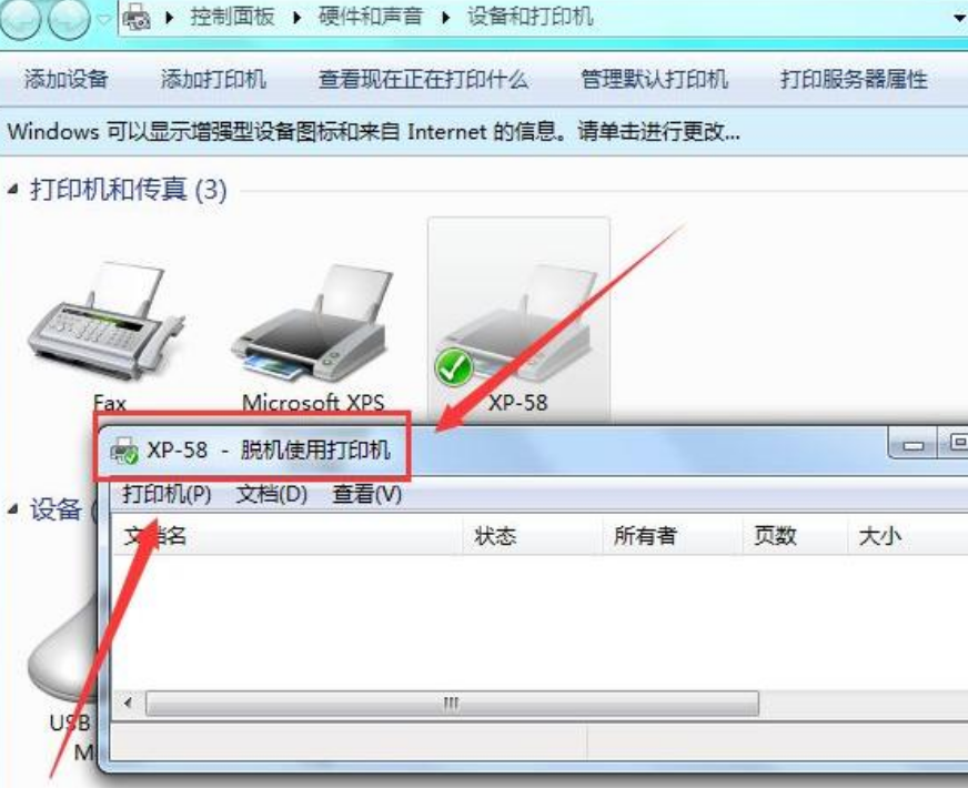 然后点击正在使用的打印机,把脱机使用打印机的勾选去掉;