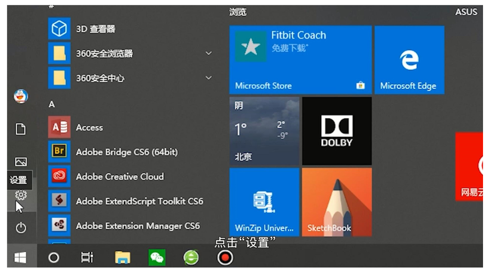 1、点击桌面左下方“开始”图标,选择“设置”。