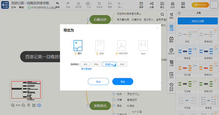 ??完善且美化好思维导图后,将其“保存”到至个人账号的云端以便更换设备查阅;或通过“导出”功能将制作好的思维导图以JPG、PNG、PDF等格式类型保存至电脑本地;亦或以链接的形式“分享”给他人查阅。